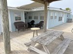- Brand-new deck with covered seating and views of both the beach and the bay