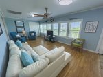 The deck and crow's nest are high enough to allow for beautiful views of the Gulf, but low enough for little legs and paws to climb the stairs. The screened-in underneath has spacious rockers and plenty of table space for boiled seafood. The extra refrigerator was a great addition. Inside the king-sized beds are a treat. The full bathrooms have tubs as well as showers--an extra luxury.